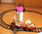 | 先日、実家にお泊りしてきました!パパが職場の旅行でいなかったので・・ ちびたんが乗ってるのは、汽車のおもちゃ♪♪ 電池でちゃんと動くんですよ~☆ でもこれ、かなり古いもの・・私の妹が今は亡き祖母に買ってもらった汽車ぽっぽなの♪ 私と妹はかなり年の差があって、妹はまだ高校生! この汽車ぽっぽは、15年くらい前のものと思われます。リミット25キロって書いてあったけど、11キロほどのちびたんが乗っても線路上ではうまく進まなかった・・やっぱり月日が経ちすぎて故障? ちびたん乗せなかったり、線路から下ろしたらちびたん乗せてもちゃんと走りました~ 写真はちびたん、足で汽車ぽっぽのバランスとって、なんとか線路上をガタゴトと走行してるところ☆ 汽車の走る音に大喜び!うしろにぬいぐるみを乗せて「ちゃんと乗っておいてね~ちゃんとつかまってないと飛んでっちゃうからネ」とぬいぐるみに顔を近付けてお話してから運転してたよ・・ なかなか汽車がやめられなくて、なかなか自宅へ帰れませんでした。母に持って帰ったらと言われたけど、場所とるし実家に来た時に遊ぶよとママは断りました。同じく妹のシルバニアファミリーのおうちや人形、家具などもおいてきたよ。来年出産で里帰りした時に、遊び慣れてないものがある方がいいと思ったしネ~! |