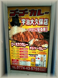 宇治日帰り旅行のランチは近鉄大久保駅前にある看板で決定!ゴーゴーカレー 宇治大久保店ゴーゴーカレーは新聞などで見て名前は知ってたけど、こんなとこにあるんだね~。金沢カレーのこのお店。松井選手のファンということでゴーゴーなんだとか。営業時間も午前10時55分~午後10時55分まで。ゴーゴータイムサービスは午後5時55分まで。と、とにかく「55」が大好きなお店です。食券を買ってカウンターで待ちます。しかし、店員さんの私語がすごいです。フツーに作りながら世間話。すごいお店だなぁ。金沢カレーってどろっとしてるのが特徴なんだそうです。キャベツが添えられていておかわり。ごはんの量はヘルシーエコノミービジネスファーストの4種類。これはロースカツカレーのエコノミー650円。これはメジャーカレー。1550円が1000円です。こんなの食べられないよ~。それに、ルーが少なすぎる!びっくりするくらい少ないです。これはゴーゴーカレー全店共通なの??これから行かれる方はルー大盛りのチケットを買ってね。最後まで食べきれずに出てきちゃってすいませんでした。。ゴーゴーカレー 宇治大久保店 (カレーライス / 大久保、新田、久津川)★★☆☆☆ 2.5