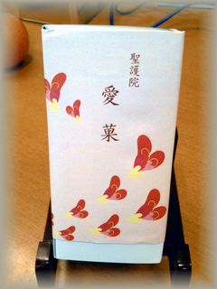 バレンタインシーズンということで、ハート型のチョコやクッキー、豚まんなど発売されていますが、八つ橋までも!聖護院八つ橋の「愛菓」かわいい~。私はもちろんゆず味をいただきました☆はむはむ。って感じでおいしくいただきましたSさんごちそうさまでした