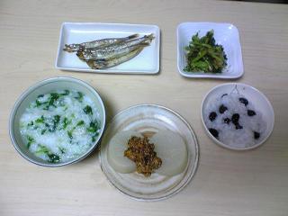 今日は七草ということで作ってみました、七草粥。実家の七草粥はお粥じゃなくて雑炊だったので、私も昔は雑炊で作ってました。違いはお粥→お米から炊く雑炊→ご飯に水足して炊くって感じ?ちなみにお粥の場合は七草もいったんゆでてカサを減らして刻んで入れるんですが。昔はざくざく切ってそのまま放り込んでいたので。草の割合もの凄く。結婚前に旦那さんに作った時に「ん。草。」っていう感想を頂いたので、結婚してからはお粥で作るようになりました。ちなみに実家方式で恥をかいたのはこれだけでなく。冬至の時にお風呂に入れる柚子。実家では半分に切って絞った後のものを入れていたのでそんなもんだと思ってたんですが。結婚後それをやったら旦那に大爆笑され。実家でその話をすると「勿体ないからああやってたけど、丸ごと入れるのが当たり前」とママンに平然と言い放たれ常識的に考えたらそうなんだけど。私切って使うことで中のエキス使ってんだと思ってましたorz。ちなみにママンに騙された(?)のはこれだけでなく。四半世紀以上前の幼児のみぎり。お相撲さんが土俵に塩撒いてんの見て「何で?」とたずねたところ、「それは怪我の治りが早くなるようによ。だから怪我した時に海に行ったら治りが早いでしょう?」としたり顔で語られ。中学くらいまでそう思ってました。だから小学校の時プール開きでお塩とお酒入れてるの見て「ああ、中で怪我してもすぐ治るようになんだなぁ」って思ってたり。ある日突然「お清めやんか!!!」って気付いてママンに抗議しましたが「そんな事言ったんだ、私面白い~」と一笑に伏されこの人の頭の中覗いてみたいものです。七草メニュー。毎年お粥のおかずで頭を悩ませます。今年は・ししゃも・大根葉のおひたし・ふろふき大根・お粥2種の貧乏質素なメニューでいってみました。毎年七草の時は余ったお粥で小豆粥も作るんですが。今年は頂き物の黒豆が余ってたので黒豆粥になりました。塩漬けの桜の花切らしてたのが悔やまれます。