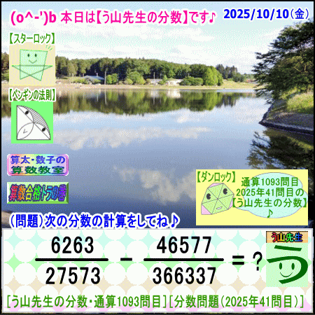 問題[う山雄一先生の分数]【分数1093問目】算数・数学天才問題[2025年10月10日]Fraction□──────────────────□【算太・数子の算数教室】(R) 【算数合格トラの巻】【う山TV(スタディ)】【う山TV(バラエティ)】【カンブリア・アカデミー】□──────────────────□(o^-')b大人気☆[う山先生式・分数計算]の問題です♪□──────────────────□□2025/10/10(金曜)□(o^-')b【う山先生の分数・通算1093問目】[分数問題(2025年41問目)]本日は2025年10月10日です。次の分数計算をしてね♪ 6263/27573 - 46577/366337 = ? 【答え】後程♪ □□──────────────────□(*^ー^)ノ通算1093問目です♪本日も面白い分数問題を作成しました☆分子・分母ともどうなるかな♪□[Fraction of Professor Uyama]доляFrakcjaFracao□──────────────────□算数・数学・家庭教師・個別指導・質問教室□──────────────────□□□□□□□□□□□□□□□□□□□□□#分数#う山先生の分数#算数#算数合格トラの巻#数学#解けたら天才#家庭教師#う山TV#う山先生#う山雄一先生#算太数子の算数教室#算太数子#算太くん#数子ちゃん #オルドビスキー博士#シルルちゃん#デボン君#白亜紀先生#カンブリアアカデミー#勉強#勉強垢#計算問題#数学垢#数学教えて#数学教える#中学受験#中学入試#高校入試#高校受験#相互フォロー□□□□□□□□□□□□□□□□□□□□□[氏名]【う山雄一】[動画]【う山TV(スタディ)】[動画]【う山TV(バラエティ)】[著書]【算太・数子の算数教室】(R)□[メインサイト]【う山先生のHP】https://uyama.theblog.me/□□[成績表・偏差値アップ]http://uyama.aikotoba.jp/seiseki/seiseki.html□□[YouTube・チャンネル]【う山TV】(スタディ)https://www.youtube.com/channel/UCnMIEU_iFTH2iP5uAH1qevQ□□[YouTube・チャンネル]【う山TV】(バラエティ)https://www.youtube.com/channel/UC32D4Nf7sEpxD_VvoaHsJaA□□[全般メール]??????@gmail.com □□[受験専用・仕事用メール]??????@gmail.com □□□□□□□□□□□□□□□□□□□□□□☆☆☆☆☆☆☆☆☆☆☆☆☆☆☆