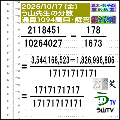 [う山先生の分数]【算数・数学】1094問目【う山先生からの挑戦状】[2025年10月17日出題]□──────────────────□(o^-')b【算数合格トラの巻】【算太・数子の算数教室】(R)【う山TV】【カンブリア・アカデミー】[Fraction of Professor Uyama]□──────────────────□□2025/10/17(金曜)□(o^-')b【う山先生の分数・通算1094問目】[分数問題(2025年42問目)]本日は2025年10月17日です。次の分数計算をしてね♪ 2118451/1xxx-xxx-xxxxx - 178/1673 = ? □□──────────────────□□(*^ー^)ノ今回も、4年生・5年生でも、頑張れば、楽しく解ける分数問題です☆[う山先生の分数]は、2023年迄で合計【1000問】2024年迄で合計【1052問】作りました☆今年も、わかりやすく通し番号(通算番号)と、その年の作成番号でいきます♪□本日も人気の【う山雄一先生の分数問題】です!楽しく解いてみて下さい♪(^^)□[YouTube]の【う山TV】の分数動画も参照してね☆□本日も、面白い分数問題を作成しました!分母・分子はどうなるかな?頑張って、5分以内で正解して下さい。『算数は面白い!』を実感してね♪(^0^)/ □[計算問題]を楽しんで解いて、【算数は面白い!で算数合格】しましょう☆(o^-')b□う山先生の予想正答率は、堂々と正解 → 30%以下頑張って正解 → 20%以下頑張ったけど惜しくも不正解 → 30%以下約分可能かどうか悩んで不正解 → 20%以下です。□ではレッツ・ゴー!!☆(^o^)/□答えは、 ↓ ↓ ↓ ↓ ↓ ↓ ↓ ↓ ↓□ ====================□♪( ´θ`)ノ【う山先生の分数・通算1094問目】[分数問題(2025年42問目)]□【答え】[1717171717/17171717171]です。(分子=1717171717→10桁)(分母=17171717171→11桁)□(解法)2118451/1xxx-xxx-xxxxx - 178/1673=3,544,168,523/17171717171-1,826,996,806/17171717171=1717171717/17171717171□□====================□♪( ´θ`)ノ本日も面白い分数問題を作成しました☆□分子は[1717171717=17が5個→10桁]分母は[17171717171=17が5個+1→11桁]です☆□♪( ´ ▽ ` )ノもちろん、答えは既約分数です☆□□====================□(*^ー^)ノ[参考]□(2118451[7桁]=257×8243)(1xxx-xxx-xxxxx[8桁]=素数)(178[3桁]=2×89)(1673[桁]=7×239)(1717171717[10桁]=17×41×271×9091)(17171717171[11桁]=7×239×1xxx-xxx-xxxxx=1673×1xxx-xxx-xxxxx)□□□──────────────────□#分数#う山先生の分数#算数#算数合格トラの巻#数学#解けたら天才#家庭教師#う山TV#う山先生#う山雄一先生#算太数子の算数教室#算太数子#算太くん#数子ちゃん #オルドビスキー博士#シルルちゃん#デボン君#白亜紀先生#カンブリアアカデミー#勉強#勉強垢#計算問題#数学垢#数学教えて#数学教える#中学受験#中学入試#高校入試#高校受験#相互フォロー□□□□□□□□□□□□□□□□□[参考]【う山先生の分数】通算1094問目□[2013年]40問[2014年]135問[2015年]143問[2016年]131問[2017年]128問[2018年]108問[2019年]105問[2020年]52問[2021年]54問[2022年]52問[2023年]52問(通算1000問)[2024年]52問(通算1052問)□[2025年]2025/01/03(金)[1/2025]1053問目2025/01/10(金)[1/2025]1054問目2025/01/17(金)[1/2025]1055問目2025/01/24(金)[1/2025]1056問目2025/01/31(金)[1/2025]1057問目2025/02/07(金)[1/2025]1058問目2025/02/14(金)[2/3456789]1059問目2025/02/21(金)[1234567/3456789]1060問目2025/02/28(金)[1/2345678]1061問目2025/03/07(金)[1/2345678]1062問目□ 2025/03/14(金)[314/15926535897]1063問目2025/03/21(金)[1234567/2345678]1064問目2025/03/28(金)[2/34567891]1065問目2025/04/04(金)[23456789/34567891]1066問目2025/04/11(金)[12356789/44444444]1067問目2025/04/18(金)[4/98765321]1068問目2025/04/25(金)[44444444/98765321]1069問目2025/05/02(金)[5/12346789]1070問目2025/05/09(金)[5/12346789]1071問目2025/05/16(金)[55555/12346789]1072問目□ 2025/05/23(金)[55555/12346789]1073問目2025/05/30(金)[55555/12346789]1074問目2025/06/06(金)[1234567/6666666]1075問目2025/06/13(金)[1313131/6666666]1076問目2025/06/20(金)[6666665/6666666]1077問目2025/06/27(金)[444455555/666666666]1078問目2025/07/04(金)[44447777777/77777774444]1079問目2025/07/11(金)[7777777/11111111111]1080問目2025/07/18(金)[7531/777555333111]1081問目2025/07/25(金)[77553311/777555333111]1082問目□2025/08/01(金)[1/888818888]1083問目2025/08/08(金)[1/88888188888]1084問目2025/08/15(金)[155555/88888888]1085問目2025/08/22(金) [777717777/8888228888]1086問目2025/08/29(金) [88889999/8888899999]1087問目2025/09/05(金) [55559999/9999955555]1088問目2025/09/12(金) [19999999999/29999999999]1089問目2025/09/19(金) [999991999999/999999199999]1090問目2025/09/26(金) [22666666/999999999]1091問目2025/10/03(金) [333333333/1xxx-xxx-xxxxx]1092問目□2025/10/10(金) [1xxx-xxx-xxxxx/1xxx-xxx-xxxxx]1093問目2025/10/17(金) [1717171717/17171717171]1094問目←本日(o^-')b □□□□□□□□□□□□□□□□□□□──────────────────□算数・数学・家庭教師・個別指導・質問教室□──────────────────□□□□□□□□□□□□□□□□□□□□□□[氏名]【う山雄一】[動画]【う山TV(スタディ)】[動画]【う山TV(バラエティ)】[著書]【算太・数子の算数教室】(R)□[メインサイト]【う山先生のHP】https://uyama.theblog.me/□□[成績表・偏差値アップ]http://uyama.aikotoba.jp/seiseki/seiseki.html□□[YouTube・チャンネル]【う山TV】(スタディ)https://www.youtube.com/channel/UCnMIEU_iFTH2iP5uAH1qevQ□□[YouTube・チ