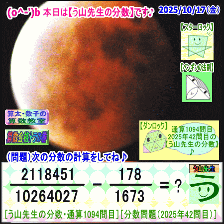 問題[う山雄一先生の分数]【分数1094問目】算数・数学天才問題[2025年10月17日]Fraction□──────────────────□【算太・数子の算数教室】(R) 【算数合格トラの巻】【う山TV(スタディ)】【う山TV(バラエティ)】【カンブリア・アカデミー】□──────────────────□(o^-')b大人気☆[う山先生式・分数計算]の問題です♪□──────────────────□□2025/10/17(金曜)□(o^-')b【う山先生の分数・通算1094問目】[分数問題(2025年42問目)]本日は2025年10月17日です。次の分数計算をしてね♪ 2118451/1xxx-xxx-xxxxx - 178/1673 = ? 【答え】後程♪ □□──────────────────□(*^ー^)ノ通算1094問目です♪本日も面白い分数問題を作成しました☆分子・分母ともどうなるかな♪□[Fraction of Professor Uyama]доляFrakcjaFracao□──────────────────□算数・数学・家庭教師・個別指導・質問教室□──────────────────□□□□□□□□□□□□□□□□□□□□□#分数#う山先生の分数#算数#算数合格トラの巻#数学#解けたら天才#家庭教師#う山TV#う山先生#う山雄一先生#算太数子の算数教室#算太数子#算太くん#数子ちゃん #オルドビスキー博士#シルルちゃん#デボン君#白亜紀先生#カンブリアアカデミー#勉強#勉強垢#計算問題#数学垢#数学教えて#数学教える#中学受験#中学入試#高校入試#高校受験#相互フォロー□□□□□□□□□□□□□□□□□□□□□[氏名]【う山雄一】[動画]【う山TV(スタディ)】[動画]【う山TV(バラエティ)】[著書]【算太・数子の算数教室】(R)□[メインサイト]【う山先生のHP】https://uyama.theblog.me/□□[成績表・偏差値アップ]http://uyama.aikotoba.jp/seiseki/seiseki.html□□[YouTube・チャンネル]【う山TV】(スタディ)https://www.youtube.com/channel/UCnMIEU_iFTH2iP5uAH1qevQ□□[YouTube・チャンネル]【う山TV】(バラエティ)https://www.youtube.com/channel/UC32D4Nf7sEpxD_VvoaHsJaA□□[全般メール]??????@gmail.com □□[受験専用・仕事用メール]??????@gmail.com □□□□□□□□□□□□□□□□□□□□□□☆☆☆☆☆☆☆☆☆☆☆☆☆☆☆