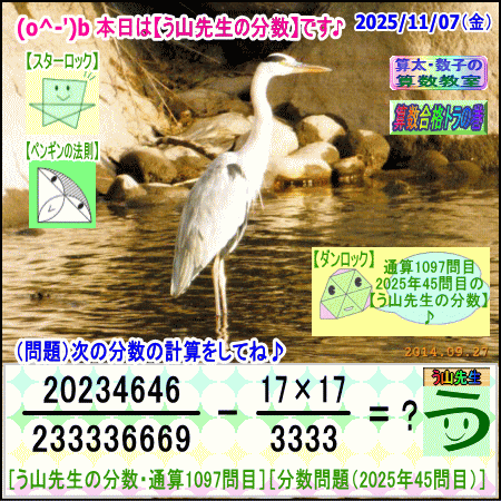 問題[う山雄一先生の分数]【分数1097問目】算数・数学天才問題[2025年11月7日]Fraction□──────────────────□【算太・数子の算数教室】(R) 【算数合格トラの巻】【う山TV(スタディ)】【う山TV(バラエティ)】【カンブリア・アカデミー】□──────────────────□(o^-')b大人気☆[う山先生式・分数計算]の問題です♪□──────────────────□□2025/11/07(金曜)□(o^-')b【う山先生の分数・通算1097問目】[分数問題(2025年45問目)]本日は2025年11月7日です。次の分数計算をしてね♪ 2xxx-xxx-xxxxx/233336669 -(17×17)/3333 = ? 【答え】後程♪ □□──────────────────□(*^ー^)ノ通算1097問目です♪本日も面白い分数問題を作成しました☆分子・分母ともどうなるかな♪□[Fraction of Professor Uyama]доляFrakcjaFracao□──────────────────□算数・数学・家庭教師・個別指導・質問教室□──────────────────□□□□□□□□□□□□□□□□□□□□□#分数#う山先生の分数#算数#算数合格トラの巻#数学#解けたら天才#家庭教師#う山TV#う山先生#う山雄一先生#算太数子の算数教室#算太数子#算太くん#数子ちゃん #オルドビスキー博士#シルルちゃん#デボン君#白亜紀先生#カンブリアアカデミー#勉強#勉強垢#計算問題#数学垢#数学教えて#数学教える#中学受験#中学入試#高校入試#高校受験#相互フォロー□□□□□□□□□□□□□□□□□□□□□[氏名]【う山雄一】[動画]【う山TV(スタディ)】[動画]【う山TV(バラエティ)】[著書]【算太・数子の算数教室】(R)□[メインサイト]【う山先生のHP】https://uyama.theblog.me/□□[成績表・偏差値アップ]http://uyama.aikotoba.jp/seiseki/seiseki.html□□[YouTube・チャンネル]【う山TV】(スタディ)https://www.youtube.com/channel/UCnMIEU_iFTH2iP5uAH1qevQ□□[YouTube・チャンネル]【う山TV】(バラエティ)https://www.youtube.com/channel/UC32D4Nf7sEpxD_VvoaHsJaA□□[全般メール]??????@gmail.com □□[受験専用・仕事用メール]??????@gmail.com □□□□□□□□□□□□□□□□□□□□□□☆☆☆☆☆☆☆☆☆☆☆☆☆☆☆