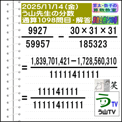 [う山先生の分数]【算数・数学】1098問目【う山先生からの挑戦状】[2025年11月14日出題]□──────────────────□(o^-')b【算数合格トラの巻】【算太・数子の算数教室】(R)【う山TV】【カンブリア・アカデミー】[Fraction of Professor Uyama]□──────────────────□□2025/11/14(金曜)□(o^-')b【う山先生の分数・通算1098問目】[分数問題(2025年46問目)]本日は2025年11月14日です。次の分数計算をしてね♪ 9927/59957 -(30×31×31)/185323 = ? □□──────────────────□□(*^ー^)ノ今回も、4年生・5年生でも、頑張れば、楽しく解ける分数問題です☆[う山先生の分数]は、2023年迄で合計【1000問】2024年迄で合計【1052問】作りました☆今年も、わかりやすく通し番号(通算番号)と、その年の作成番号でいきます♪□本日も人気の【う山雄一先生の分数問題】です!楽しく解いてみて下さい♪(^^)□[YouTube]の【う山TV】の分数動画も参照してね☆□本日も、面白い分数問題を作成しました!分母・分子はどうなるかな?頑張って、5分以内で正解して下さい。『算数は面白い!』を実感してね♪(^0^)/ □[計算問題]を楽しんで解いて、【算数は面白い!で算数合格】しましょう☆(o^-')b□う山先生の予想正答率は、堂々と正解 → 30%以下頑張って正解 → 20%以下頑張ったけど惜しくも不正解 → 30%以下約分可能かどうか悩んで不正解 → 20%以下です。□ではレッツ・ゴー!!☆(^o^)/□答えは、 ↓ ↓ ↓ ↓ ↓ ↓ ↓ ↓ ↓□ ====================□♪( ´θ`)ノ【う山先生の分数・通算1098問目】[分数問題(2025年46問目)]□【答え】[111141111/11111411111]です。(分子=111141111→9桁)(分母=11111411111→11桁)□(解法)9927/59957 -(30×31×31)/185323=1,839,701,421/11111411111-1,728,560,310/11111411111=111141111/11111411111□□====================□♪( ´θ`)ノ本日も面白い分数問題を作成しました☆11月14日の分数問題です♪□分子は[111141111=1が4個+4+1が4個→9桁]分母は[11111411111=1が5個+4+1が5個→11桁]です☆□♪( ´ ▽ ` )ノもちろん、答えは既約分数です☆□□====================□(*^ー^)ノ[参考]□(9927[4桁]=3×3×1103)(59957[5桁]=素数) (28830[5桁]=2×3×5×31×31=30×31×31)(185323[6桁]=素数) (111141111[9桁]=3×43×861559)(11111411111[11桁]=59957×185323)□□□──────────────────□#分数#う山先生の分数#算数#算数合格トラの巻#数学#解けたら天才#家庭教師#う山TV#う山先生#う山雄一先生#算太数子の算数教室#算太数子#算太くん#数子ちゃん #オルドビスキー博士#シルルちゃん#デボン君#白亜紀先生#カンブリアアカデミー#勉強#勉強垢#計算問題#数学垢#数学教えて#数学教える#中学受験#中学入試#高校入試#高校受験#相互フォロー□□□□□□□□□□□□□□□□□[参考]【う山先生の分数】通算1098問目□[2013年]40問[2014年]135問[2015年]143問[2016年]131問[2017年]128問[2018年]108問[2019年]105問[2020年]52問[2021年]54問[2022年]52問[2023年]52問(通算1000問)[2024年]52問(通算1052問)□[2025年]2025/01/03(金)[1/2025]1053問目2025/01/10(金)[1/2025]1054問目2025/01/17(金)[1/2025]1055問目2025/01/24(金)[1/2025]1056問目2025/01/31(金)[1/2025]1057問目2025/02/07(金)[1/2025]1058問目2025/02/14(金)[2/3456789]1059問目2025/02/21(金)[1234567/3456789]1060問目2025/02/28(金)[1/2345678]1061問目2025/03/07(金)[1/2345678]1062問目□ 2025/03/14(金)[314/15926535897]1063問目2025/03/21(金)[1234567/2345678]1064問目2025/03/28(金)[2/34567891]1065問目2025/04/04(金)[23456789/34567891]1066問目2025/04/11(金)[12356789/44444444]1067問目2025/04/18(金)[4/98765321]1068問目2025/04/25(金)[44444444/98765321]1069問目2025/05/02(金)[5/12346789]1070問目2025/05/09(金)[5/12346789]1071問目2025/05/16(金)[55555/12346789]1072問目□ 2025/05/23(金)[55555/12346789]1073問目2025/05/30(金)[55555/12346789]1074問目2025/06/06(金)[1234567/6666666]1075問目2025/06/13(金)[1313131/6666666]1076問目2025/06/20(金)[6666665/6666666]1077問目2025/06/27(金)[444455555/666666666]1078問目2025/07/04(金)[44447777777/77777774444]1079問目2025/07/11(金)[7777777/11111111111]1080問目2025/07/18(金)[7531/777555333111]1081問目2025/07/25(金)[77553311/777555333111]1082問目□2025/08/01(金)[1/888818888]1083問目2025/08/08(金)[1/88888188888]1084問目2025/08/15(金)[155555/88888888]1085問目2025/08/22(金) [777717777/8888228888]1086問目2025/08/29(金) [88889999/8888899999]1087問目2025/09/05(金) [55559999/9999955555]1088問目2025/09/12(金) [19999999999/29999999999]1089問目2025/09/19(金) [999991999999/999999199999]1090問目2025/09/26(金) [22666666/999999999]1091問目2025/10/03(金) [333333333/1xxx-xxx-xxxxx]1092問目□2025/10/10(金) [1xxx-xxx-xxxxx/1xxx-xxx-xxxxx]1093問目2025/10/17(金) [1717171717/17171717171]1094問目2025/10/24(金) [1/1xxx-xxx-xxxxx]1095問目2025/10/31(金) [1xxx-xxx-xxxxx/1xxx-xxx-xxxxx]1096問目2025/11/07(金) [7777777/777711117777]1097問目2025/11/14(金) [111141111/11111411111]1098問目←本日(o^-')b □□□□□□□□□□□□□□□□□□□──────────────────□算数・数学・家庭教師・個別指導・質問教室□──────────────────□□□□□□□□□□□□□□□□□□□□□□[氏名]【う山雄一】[動画]【う山TV(スタディ)】[動画]【う山TV(バラエティ)】[著書]【算太・数子の算数教室】(R)□[メインサイト]【う山先生のHP】https://uyama.theblog.me/
