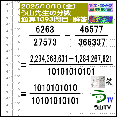 解答[う山先生の分数]【分数1093問目】算数・数学天才問題[2025年10月10日出題]Fraction□──────────────────□【カンブリア・アカデミー】【算太・数子の算数教室】(R) 【算数合格トラの巻】【う山TV】(スタディ/バラエティ)□──────────────────□(o^-')b大人気☆[う山先生式・分数計算]の問題です♪[Fraction of Professor Uyama]□──────────────────□□2025/10/10(金曜)□(o^-')b【う山先生の分数・通算1093問目】[分数問題(2025年41問目)]本日は2025年10月10日です。次の分数計算をしてね♪ 6263/27573 - 46577/366337 = ? □====================□♪( ´θ`)ノ【う山先生の分数・通算1093問目】[分数問題(2025年41問目)]□【答え】[1xxx-xxx-xxxxx/1xxx-xxx-xxxxx]です。(分子=1xxx-xxx-xxxxx→10桁)(分母=1xxx-xxx-xxxxx→11桁)□(解法)6263/27573 - 46577/366337=2,294,368,631/1xxx-xxx-xxxxx-1,284,267,621/1xxx-xxx-xxxxx =1xxx-xxx-xxxxx/1xxx-xxx-xxxxx□□====================□♪( ´θ`)ノ本日も面白い分数問題を作成しました☆[10月10日の分数問題]です♪□分子は[1010101010=10が5個→10桁]分母は[10101010101=10が5個+1→11桁]です☆□♪( ´ ▽ ` )ノもちろん、答えは既約分数です☆□□ ====================□(*^ー^)ノ[参考]□(6263[4桁]=素数)(27573[5桁]=3×7×13×101)(46577[5桁]=47×991)(366337[6桁]=37×9901)(1xxx-xxx-xxxxx[10桁]=2×5×41×271×9091)(1xxx-xxx-xxxxx[11桁]=3×7×13×37×101×9901=27573×366337)□□□──────────────────□#分数#う山先生の分数#算数#算数合格トラの巻#数学#解けたら天才#家庭教師#う山TV#う山先生#う山雄一先生#算太数子の算数教室#算太数子#算太くん#数子ちゃん #オルドビスキー博士#シルルちゃん#デボン君#白亜紀先生#カンブリアアカデミー#勉強#勉強垢#計算問題#数学垢#数学教えて#数学教える#中学受験#中学入試#高校入試#高校受験#相互フォロー□□□□□□□□□□□□□□□□□[参考]【う山先生の分数】通算1093問目□[2013年]40問[2014年]135問[2015年]143問[2016年]131問[2017年]128問[2018年]108問[2019年]105問[2020年]52問[2021年]54問[2022年]52問[2023年]52問(通算1000問)[2024年]52問(通算1052問)□[2025年]2025/01/03(金)[1/2025]1053問目2025/01/10(金)[1/2025]1054問目2025/01/17(金)[1/2025]1055問目2025/01/24(金)[1/2025]1056問目2025/01/31(金)[1/2025]1057問目2025/02/07(金)[1/2025]1058問目2025/02/14(金)[2/3456789]1059問目2025/02/21(金)[1234567/3456789]1060問目2025/02/28(金)[1/2345678]1061問目2025/03/07(金)[1/2345678]1062問目□ 2025/03/14(金)[314/15926535897]1063問目2025/03/21(金)[1234567/2345678]1064問目2025/03/28(金)[2/34567891]1065問目2025/04/04(金)[23456789/34567891]1066問目2025/04/11(金)[12356789/44444444]1067問目2025/04/18(金)[4/98765321]1068問目2025/04/25(金)[44444444/98765321]1069問目2025/05/02(金)[5/12346789]1070問目2025/05/09(金)[5/12346789]1071問目2025/05/16(金)[55555/12346789]1072問目□ 2025/05/23(金)[55555/12346789]1073問目2025/05/30(金)[55555/12346789]1074問目2025/06/06(金)[1234567/6666666]1075問目2025/06/13(金)[1313131/6666666]1076問目2025/06/20(金)[6666665/6666666]1077問目2025/06/27(金)[444455555/666666666]1078問目2025/07/04(金)[44447777777/77777774444]1079問目2025/07/11(金)[7777777/11111111111]1080問目2025/07/18(金)[7531/777555333111]1081問目2025/07/25(金)[77553311/777555333111]1082問目□2025/08/01(金)[1/888818888]1083問目2025/08/08(金)[1/88888188888]1084問目2025/08/15(金)[155555/88888888]1085問目2025/08/22(金) [777717777/8888228888]1086問目2025/08/29(金) [88889999/8888899999]1087問目2025/09/05(金) [55559999/9999955555]1088問目2025/09/12(金) [19999999999/29999999999]1089問目2025/09/19(金) [999991999999/999999199999]1090問目2025/09/26(金) [22666666/999999999]1091問目2025/10/03(金) [333333333/1xxx-xxx-xxxxx]1092問目 □2025/10/10(金) [1xxx-xxx-xxxxx/1xxx-xxx-xxxxx]1093問目←本日(o^-')b □□□□□□□□□□□□□□□□□ □──────────────────□算数・数学・家庭教師・個別指導・質問教室□──────────────────□□□□□□□□□□□□□□□□□□□□□□[氏名]【う山雄一】[動画]【う山TV(スタディ)】[動画]【う山TV(バラエティ)】[著書]【算太・数子の算数教室】(R)□[メインサイト]【う山先生のHP】https://uyama.theblog.me/□□[成績表・偏差値アップ]http://uyama.aikotoba.jp/seiseki/seiseki.html□□[YouTube・チャンネル]【う山TV】(スタディ)https://www.youtube.com/channel/UCnMIEU_iFTH2iP5uAH1qevQ□□[YouTube・チャンネル]【う山TV】(バラエティ)https://www.youtube.com/channel/UC32D4Nf7sEpxD_VvoaHsJaA□□[全般メール]??????@gmail.com □□[受験専用・仕事用メール]??????@gmail.com □□□□□□□□□□□□□□□□□□□□□□☆☆☆☆☆☆☆☆☆☆☆☆☆☆☆