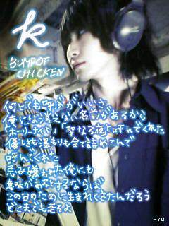 どもっ!引地礼央でございます(=゚ω゚)ノぃや~、世の中早いもので、またまたスタジオに行くことになりますた前回はシールドを忘れるという大失態犯してるんで、今回はもう既にばっちりカバンにinしてますちなみに明日スタジオ行くうち1人はあんまし話したことない人で、もう1人は初対面デス初対面の方の人がぉりにギターを教えてくれるそうなんで、しっかり習ってきますっちなみに今日は模試でした結果は言わずもがな全然ダメ・・・前回の模試は国語が結構よかったんで、ちょっと調子に乗ってたら、今回は殺された感じまぁ、模試ゃからというイイワケをしてみる・・・ぁぁ~、今日はBUMPがキてるなぁ~・・・今は『K』がかかってます (部屋でかけてます笑"んじゃ、『K』でも貼ってみようカナ んじゃ、ぉりの日記を読んでくれた方は クリックに御協力を・・・