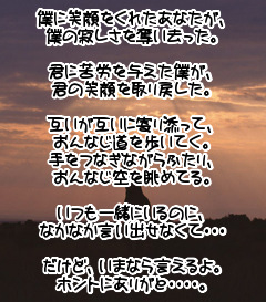 どもっ!引地礼央でございます(=゚ω゚)ノ今日は、大切な人のために詩なりと書いてみたッス(,,゚д゚)けど、恥ずかしいから見せられません~笑”その代わりに、ぱっと頭に浮かんだ詩を画像にしてみたんで、貼ってみます。。ド素人が書いたものなんで、変でも多めにみてやってくださぃな・・・(;´Д`A ```台詞がくさいね汗"