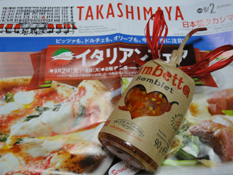 暑さが戻った上に湿度が高く、蒸し暑い一日でした仕事が速く終わったので、日本橋タカシマヤのイタリアンフェアへ。お目当てはこちらカラブリア特産の唐辛子と野菜をあわせたピリカラソースです。違うメーカーですが以前Tropeaで買ってから、お気に入りに唐辛子だけの物は時々見かけるけれど、野菜が入っている物はなかなかないのですよね。ブッラータの試食もして、大満足です買わなかったけど・・・。ごちそうさまでした。にほんブログ村