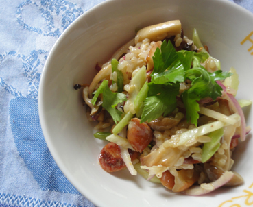材料 1人分・サラダ用ブラウンライス 1袋・ソーセージ 1本・エリンギ 1本・シメジ 1/2房・紫玉ねぎ 1/4個・セロリ 1/2本ドレッシング×オリーブオイル 大さじ1×マスタード 小さじ1×メイプルシロップ 小さじ1作り方1 サラダ用ブラウンライスは熱湯で10分ゆで、冷水で洗い水気をとっておく。2 ソーセージ、キノコを一口大に切り、オリーブオイルで炒める。3 紫玉ねぎ、セロリを薄く切る。 4 ドレッシングと他の材料を混ぜる。グリーンペッパー風味のマスタードを使うと、大人の味に。プチプチしたブラウンライスとソーセージで、腹持ちもいいので、お弁当にもいいですよ赤ワインにもあいます。