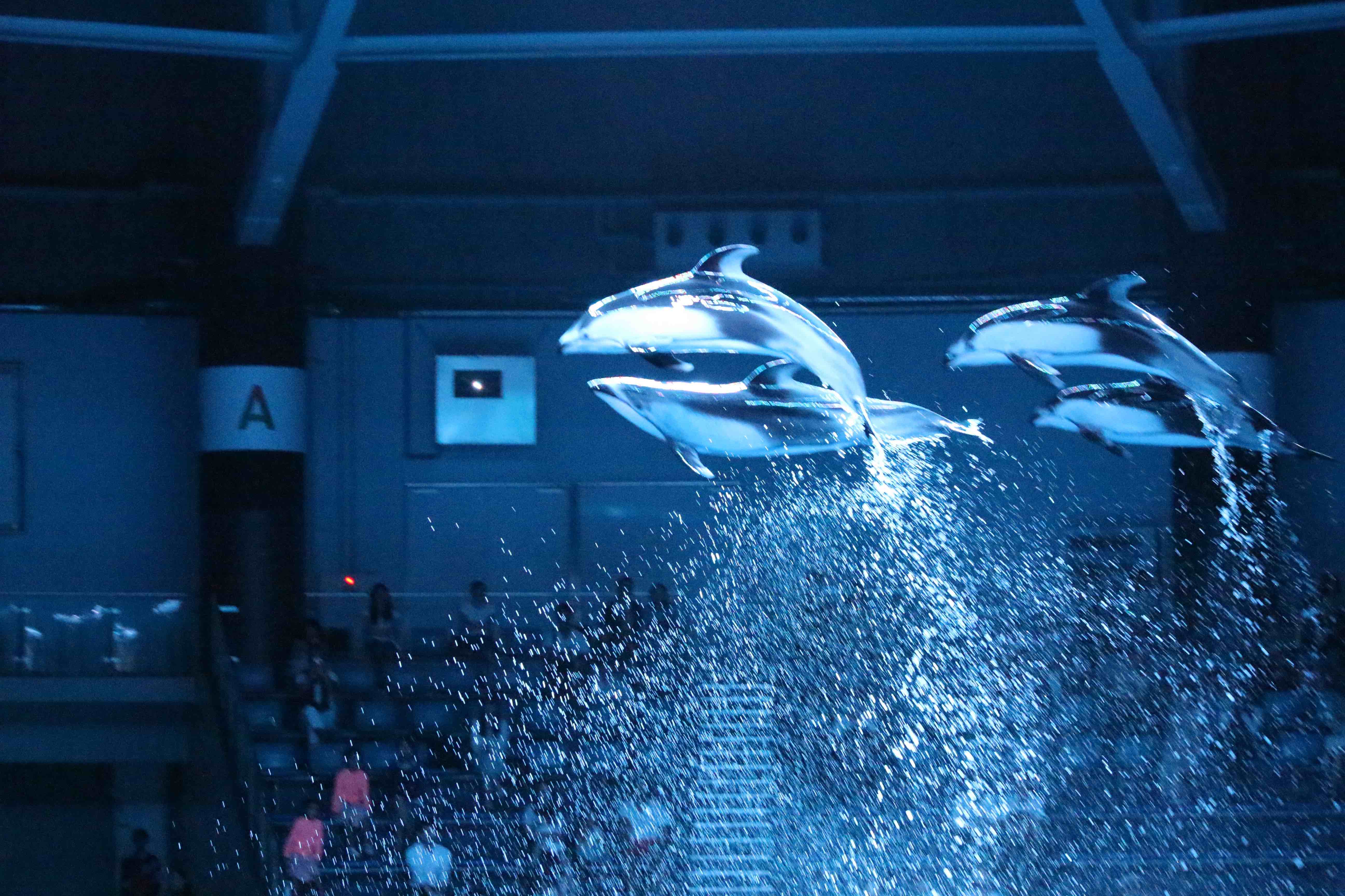 光の中を飛ぶイルカさん達。光が飛んでいるみたいです。