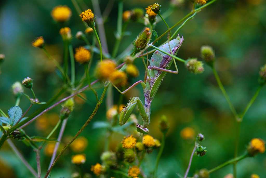 産卵前でしょうかお腹の膨らんだハラビロカマキリの♀のようです良く見ると足が一本欠損していたり傷を負っていることが分かりますもう少し食べて栄養をつけようとしているようでコセンダングサに潜んで近くにやってくるアブやハチを目で追いかけていました2025.10.19 撮影CAMERA : PENTAX K-mLENS : 17-70/2.8-4.5 DC MACRO