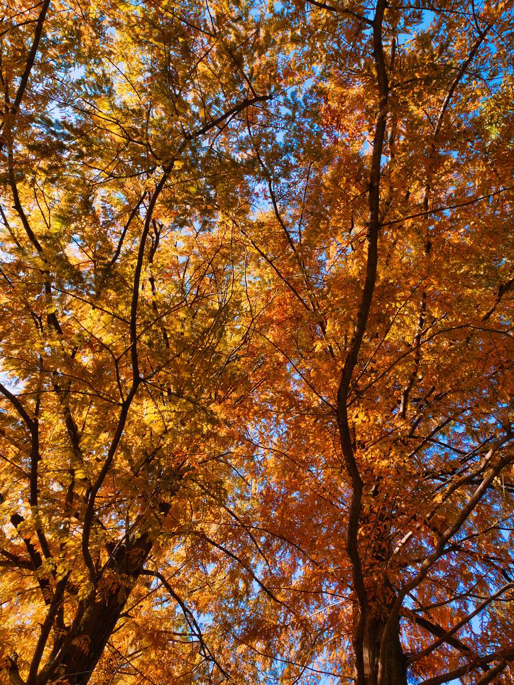 青空の下お日さまの光に照らされたメタセコイアの葉っぱが輝いています2025.11.15 撮影CAMERA : Panasonic DMC-L1Lens : OLYMPUS ZUIKO DIGITAL ED 12-60/2.8-4.0 SWD