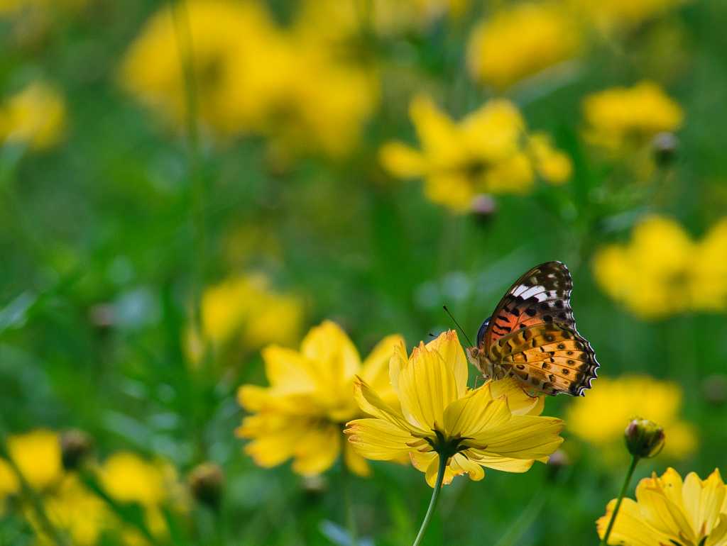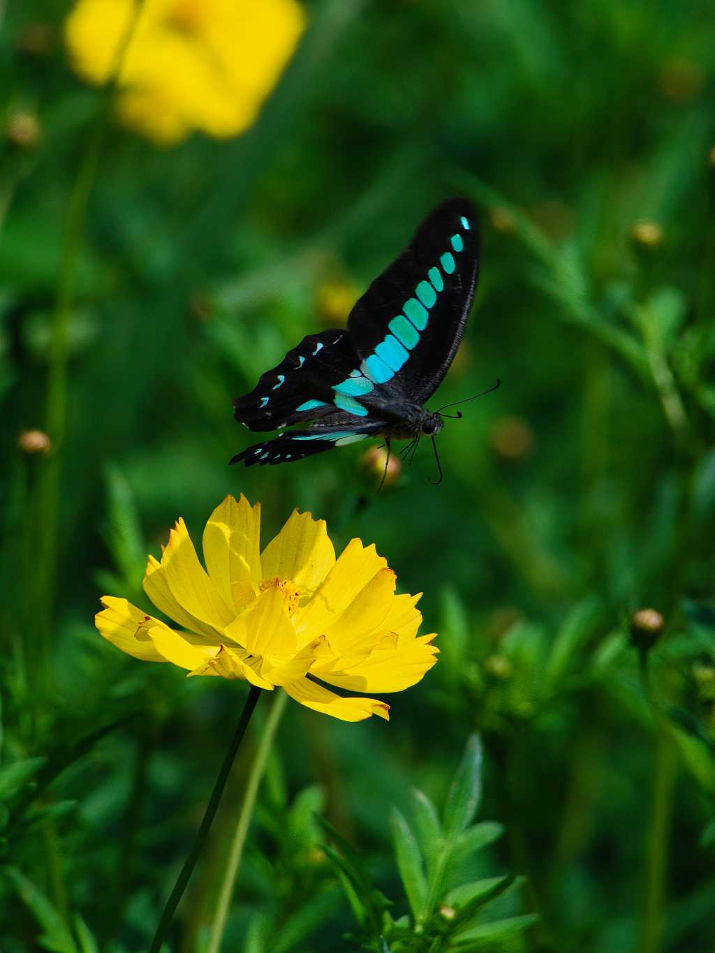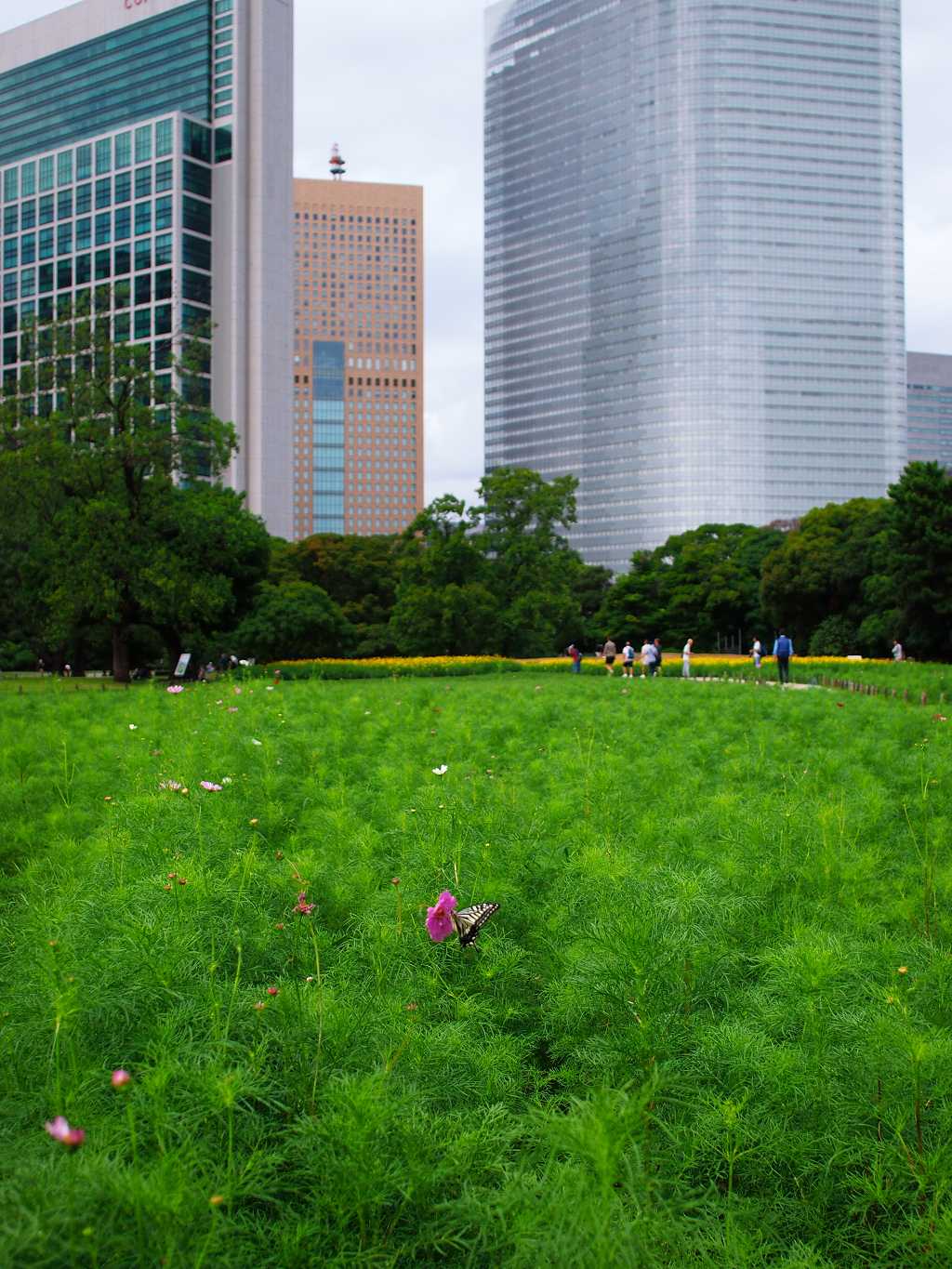 チョウチョを撮りに浜離宮に行ってきました奥に見える黄色いゾーンはキバナコスモス手前の緑はコスモスゾーン開花は1分にも満たない状態ですがナミアゲハがやってきました2025.09.28 撮影CAMERA : OLYMPUS E-PM1LENS : SIGMA 19/2.8 DN