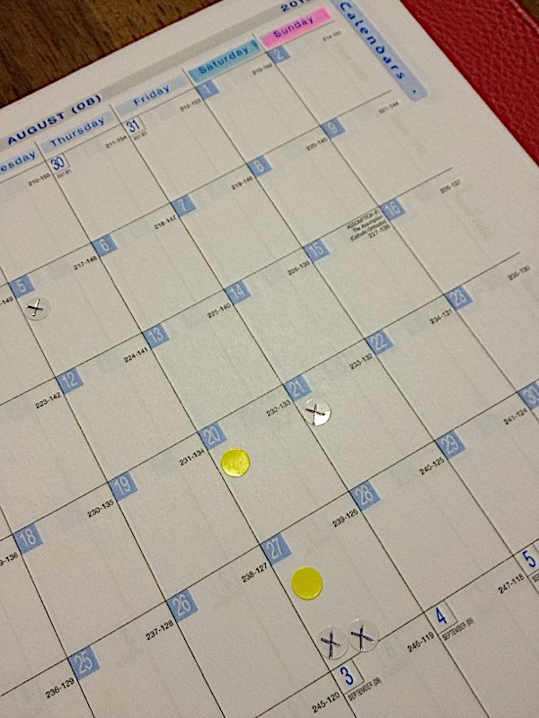 連投すみません💦 書ける時に書かないと、放置プレイしちゃうんで…。 さて。 先程終わったクォバディスお披露目会。 只今、クォバディスのカスタマイズをしています。 まず、土日が分かりづらいので、色付けしました。 そして、家族・親族の誕生日の印付け。 給料日の印付け。 支払い日の印付け。 いちいち書くと面倒なので、シールを貼ります。 土曜日を青にしたら、意味無くね? …なんて言わないで下さいね(笑) 私の中で、土曜日は青なんですよ…。 上から塗るだけでも違うんです…。 黄色は給料日、白シールにバッテン印は支払い日にしました。 この月には無いですが、赤は親族や家族の誕生日。 緑はコミック発売日(笑) まぁ、色分け方法はともかく💦 パッと開いた時に、シールがあれば週間ページに詳細が書かれている…と言う使い方をしようと思っています。 例えば、白バッテンシールが二つ貼ってあれば、支払いが二つある…という感じです。 給料日も支払日も固定だから(土日で前後する程度)、サッサと貼ってしまえばOK(^^) 子供の行事は、来年にならないと分からないけど、それ位なら充分書けます。 何でも書くとゴチャゴチャしてしまうので、 こういう方法にしました。