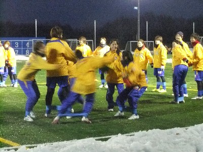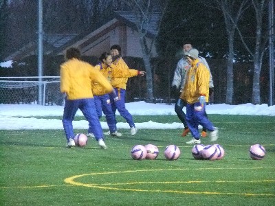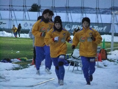 練習開始前には仙台を退団した田中・中原が訪れ、チームメイトと別れの挨拶をしていました。もう、このふたりのツーショットは無いのかな?クラブハウスも完成し、早速メンバー達も真新しいクラブハウスを使っていました。練習前には新加入選手を含めて選手全員で雪かき。その後、円陣を組んで監督の挨拶や新加入メンバーが自己紹介。高良・佐々木・井上・成宮の新加入メンバー4選手も加わり、24選手全員揃いランニングや鬼ごっこ?やボールを使ってのトレーニングでスタートさせたが、ほとんどの時間はランニングに費やしていました。 安本紗和子 作 雪だるま