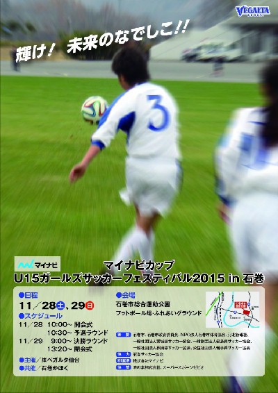 ◎ 高良亮子選手の負傷29日(日)にオランダ・フォーレンダムでのオランダ代表との国際親善試合になでしこジャパンメンバーに招集された高良でしたが、22日の皇后杯大東文化大学との3回戦で負傷し、左内転筋筋断裂で全治約8週間の見込みと大怪我だった。怪我に伴いなでしこジャパンメンバーを辞退した。今後の皇后杯出場は叶いませんが治す事に専念して来季の開幕に備えてほしいです。残る皇后杯の左SBは井手上と万屋のポジション争いになるかな。29日(日)にオランダ・フォーレンダムでのオランダ代表との国際親善試合がNHK-BSでの生放送が決まった。川村・有町・坂井の3選手をスタメンで見てみたいです。◎ 『マイナビカップU-15ガールズサッカーフェスティバル2015 in石巻』開催今週末の28日(土)・29日(日)の両日に石巻市総合運動公園フットボール場・ふれあいグラウンドで東北6県の女子中学生『マイナビカップU-15ガールズサッカーフェスティバル2015 in石巻』が開催される。ベガルタ仙台レディースJrユースは創設1年ちょっとの今季東北大会で優秀を果たしている。この大会もベガルタ仙台レディースJrユース中心に繰り広げられると思いますので優勝してほしいですね。どうぞ、石巻近辺に限らず応援に行って上げて下さい。