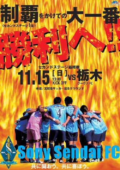 ◎ JFL ソニー仙台 2-1 栃木ウーヴァ 公式記録JFL最終節、ソニー仙台が勝てば自動的にセカンドステージ優勝が決まる大事な試合。決戦の場所は県サッカー場。スタンドが満員と準備は万端。ソニー仙台は前半4分、40分と2ゴールで2-0で前半を折り返した。後半に入ってもソニー仙台が攻め続けたが、後半39分に栃木の右CKから失点すると栃木の勢いが出たが、ソニー仙台が1点リードを守り切って2-1で勝利と同時にJFLセカンドステージ優勝が決まった。 喜ぶソニー仙台メンバー。 表彰式 ファーストステージでは、ヴァンラーレ八戸と勝ち点34で同じながら得失点差で2位のソニー仙台。ファースト・セカンドステージ総合なら間違いなく年間優勝だが、JFLではファーストステージ1位とセカンドステージ1位のホーム&アウェーでの直接対決で年間優勝を決める。◎ チャンピオンシップスケジュール ◎ 11月29日(日) アウェー 五戸町ひばり野公園陸上競技場 ◎ 12月 5日(土) ホーム ユアスタ *いずれもキックオフは午後1時。