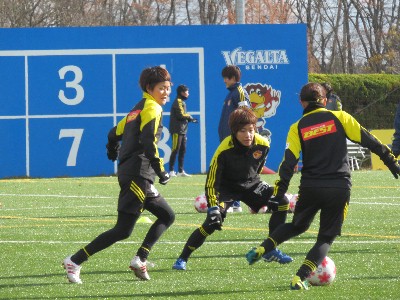 ガンジュ岩手との練習試合を終えた本日は泉サッカー場で軽めの調整。ウイルソンと村上、西村は別メニュー調整。 3対3のサッカーバレー。 練習途中で切り上げ、レディースの試合応援でユアスタに移動。