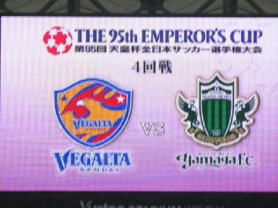 時より強い雨が降り続けたユアスタ。松本は異例と思える試合前々日仙台入りして仙台で調整して来た。仙台もリーグ戦より若干メンバーが変わっているが互いに両チームとも多くの主力選手で天皇杯4回戦に挑んで来た。◎ 天皇杯4回戦 仙台 2-1 松本 公式記録NHK-BSで生中継された事でTVの前で応援していた方も多かったと思います。特に松本サポさんにとって胃がキリキリと痛んだ事でしょう。前節神戸に敗れ1年でJ2降格が決まった松本は残る天皇杯に望みをかけて攻めて来ると思われたが、全員で守備固めでカウンター狙いと逆に仙台は松本の引いて守る守備陣をショートパスで繋いで崩して攻め込む。前半29分に梁が大きく展開してのクロスに菅井が攻めたがゴールならず。36分にも梁のパスから金園のシュートはクロスバーに嫌われと前半は0-0のスコアレスで後半へ折り返した。後半に入っても仙台が攻め続け、後半22分に奥埜シュートがポストに嫌われるもこぼれ球から梁のパスを富田が押し込み待望の先制点を挙げた。36分にも梁の左CKからゴール前が混戦となり、最後は菅井が押し込み追加点を奪い2-0とした。41分に松本の左CKから渡部のクリアボールが山本に当たり、オウンゴールを献上した。試合は2-1で終了し、仙台は準々決勝に進出しBEST8に入った。準々決勝は12月26日(日)会場未定に明日に行われる柏と甲府との勝者とBEST8目指して戦う。12月末までと選手も大変でしょうがサポーターにとってまたひとつ楽しみが増えた。90分を通して松本側のコートでの試合が多く、仙台が松本のシュート数の倍浴びせ仙台が攻め松本が耐えるおしんサッカーだったのかなぁと思えた試合でした。それにしても今日の扇谷主審の笛は松本寄りだったかな。次には六反やミンテと代表組みも戻って来ますね。それにしても雨が止まずに上下びしょ濡れになりながらの応援でタオルマフラーを何度絞っても水が大量に出た。途中に見かねた親切なボランティアの方からタオルが差し出され有難かったです。 明日は県サッカー場でソニー仙台のJFL最終節があり、ソニー仙台が勝てばJFL優勝が決まりますので県サッカーで応援しましょう!!