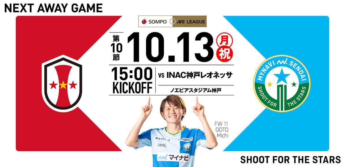 次節13日(月・祝)アウェーノエビアスタジアム神戸でのINAC神戸レオネッサ戦に挑む。15:00キックオフ。