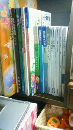 今日は2回目の更新です⌒♪なんかさっきはグチっぽいものばっかり書いちゃったので…;;ちょっと楽しい(かな?)ハナシしますwえっと、昨日は合格者登校日で、高校に行ってきたわけですが、そのときもらった教科書!!!じゃ~~~ん!!笑なんかサイズが小さい教科書で、かわいいでしょwこれは主教材で、副教材はまた入学式に購入するそうです。二回に分けてくれて良かった;;一度に全部持ち帰るのは大変だもんね;;なんか、部屋の中が中学から高校に移り変わって行くみたいで嬉しいです♪いや、別に中学も好きだったけどさ。笑新しいモノ好きなんですよ、うちwそれでわッッ☆