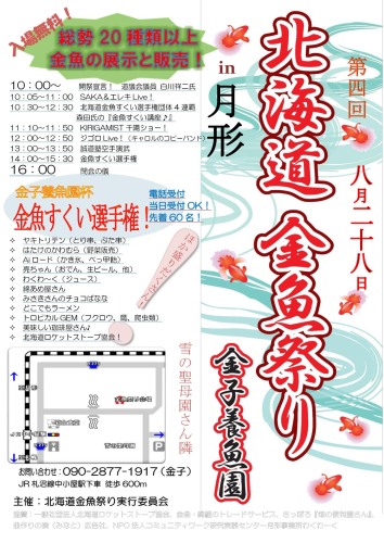 ある繋がりからお友達になれた、月形の金魚屋さん畑のお手伝いや、何でも屋さんなどをシノギとしているのですが、大きな体格で気は優しい大男ですその、金魚屋さんが今月の28日に第四回 北海道金魚祭りイン月形を開催するんですという事で、心ばかりではありますが、このブログにて私の参加もありますので、皆さん、お暇なら来てよね