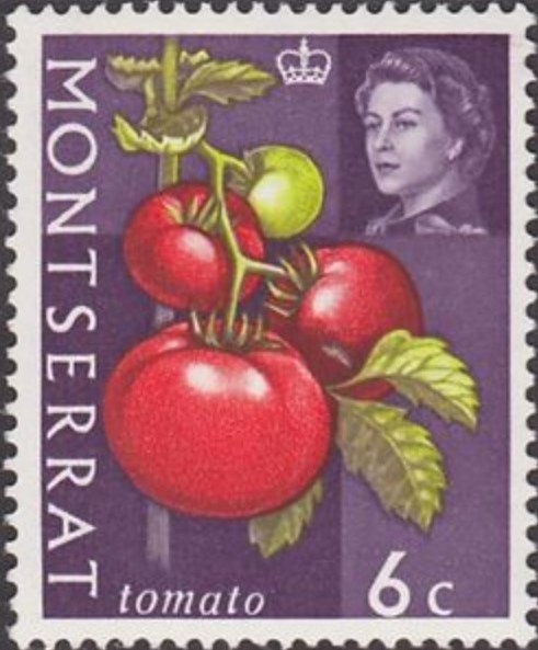 切手は1965年モントセラト発行の「農産物切手」の中の一枚で、トマトの株に青いトマトと完熟トマトがなっているのが描かれています。