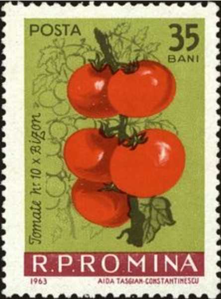 切手は1963年ルーマニア発行の「野菜切手」の中の一枚で、完熟トマトがなっているのが描かれています。