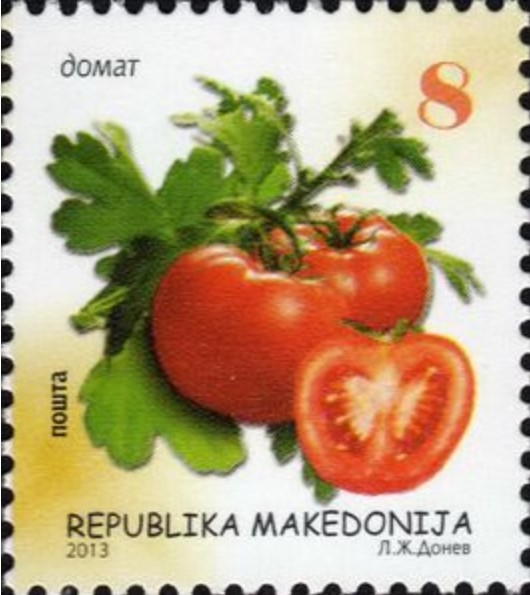 切手は2013年マケドニア発行の「野菜切手」の中の一枚で、実った完熟トマトとそのトマトの断面が描かれています。