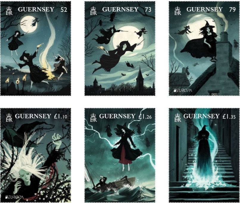 切手は2022年イギリス領ガーンジー島発行の「2022年ヨーロッパ切手 神話と伝説の6種で、魔女の夜の集まり、家に帰る魔女、空を飛び回る魔女、いけにえの魔女など、古くから伝わる魔女の物語が描かれています。