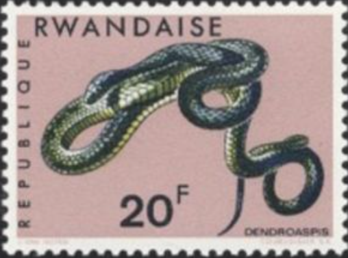 1967年ルワンダ発行の「ヘビ切手」の中の一枚で、ジェイムソンマンバ が描かれています。