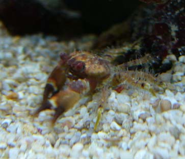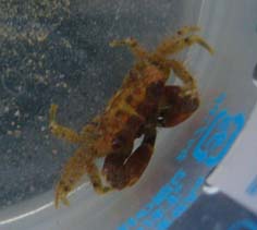 とうとうカニを捕まえました!!カニがいたので、捕まえようと思い、水槽内をピンセットでホジホジしていたら、ライブロックが軽く崩壊・・・組直さないとと思い、ライブロックを持ち上げると、カニがライブロックにくっ付いていたので、捕獲♪もう一匹カニがいるので、カニがいるライブロックを水槽から取り出し、格闘の末、捕獲できました♪両方とも同じ種類のカニだと思います。右の方がでかいです。捕獲時、ハサミを片方失ってしまった。水槽内でカニ被害があったわけではないが、日に日に大きくなっていくカニを野放しにしていくのも怖く、捕まえたことで、カニ被害をみぜんに防ぐことが出来たかもしれません。捕まえたカニは、プリンのカップに入れています。処分どうしよう。