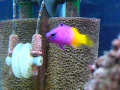 わが水槽の番長はこいつです!!ロイヤルグラマー1月頭に家に来ましたが、エサをバクバク食べ、一回りは大きくなりました。性格は、荒め目。一緒に泳いでいると思ったら、ハタタテハゼやカクレに口を開けて威嚇。噛み付く感じで迫っています。威嚇されてカクレが嫌がっています。↓ハゼ系の底にいる魚には威嚇はしません。こいつがいるかぎり、よわっちい魚は買えない気がするな~。