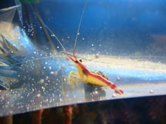 スカンクシュリンプを仲間入りさせました!こいつで3代目になります。一代目は35cm水槽時代で、一ヶ月で☆二代目は今の水槽で、一週間で☆一代目のときは、いつもなら魚達にエサをあげると、ものすごい勢いで水面まで上がってきてエサを食べていたのが、急に食べなくなり動きも鈍り、次の日に☆二代目は、投入して一週間目に脱皮にして、次の日は普段隠れないライブロックの下に隠れていて、次の朝には殻だけになっていました☆正直、エビはうまく飼えていません・・・今回こそは、長期飼育させてたいです!!一緒にチビヤドカリも一匹仲間入り♪(写真のエビの後ろにいるやつ)