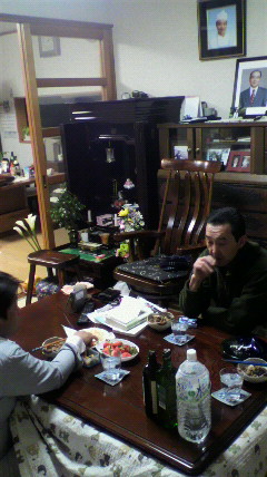 そんなたくちゃんが、昨夜の会談後、私の実家に泊まりにきてくれた。写真は岩手県田野畑村羅賀から来たいとこのアニキとたくちゃんのツーショット・・・おっと、後ろには田野畑生まれのオヤジの遺影つきですがね。