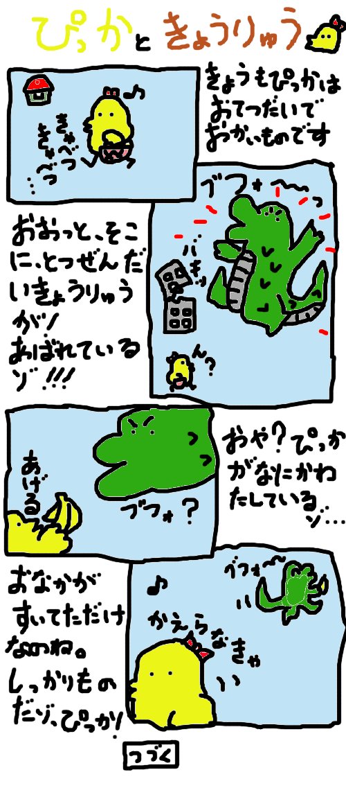 ぴっかは四人兄弟の長女。まだ子供ですが、ぴよぴよのお手伝いでお買い物に行ったりする、しっかりものです。ときどき事件にまきこまれますが、いつもマイペースでのりきります。