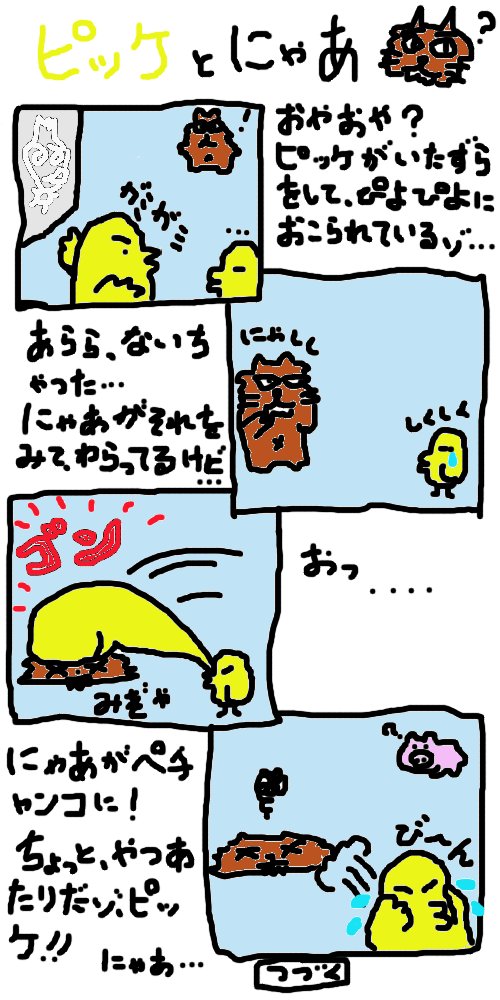 「にゃあ」はきょうぼうな猫で、いつもぴよぴよたちをいじめてやろうと狙っています。でも、そのたびに返り討ちに。。。にゃあは気づいてないかもしれませんが、ぴよぴよたちと遊びたいだけなのかもしれません。