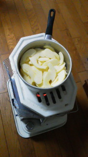 冷蔵庫に古いリンゴが三個あったので、ジャム作りに挑戦です。皮はしなしなですが、実は大丈夫。薄切りにして、30%の砂糖と、20%の水、後、煮立ってから赤ワインを加えて、じっくりストーブでぐつぐつと。。。柔らかくなったら実をつぶして、さらにぐつぐつと。。。出来上がりです。容器二つ分になったので、冷蔵庫で保存です。朝食のパンにぬったら、、、なかなかの美味。娘も喜んで食べてました。