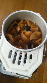 朝方、ちょっと寒かったので、ストーブで豚の角煮を作りました。豚バラブロックを適当に切って、醤油につけた後、軽くフライパンであぶって、後は大根、卵と一緒にぐつぐつと。。。1時間ぐらいでこんな感じになりました。 大根の色もいい感じです。 続いて夕方、シリコンスチーマーで鯖の味噌煮に挑戦です。鯖は皮に十字に包丁を入れてから湯通し。スチーマーに入れて、ショウガを乗せ、タレをかけてふたをしたら、レンジでチンと。3分でやったら、ちょっと生っぽかったので、後2分追加したらいい感じにできました。 ストーブと違って、量を増やしたらその分加熱時間を多くしないとだめですね。あと、明日からの子供達の弁当用にほうれんそうのおひたしも作りました。さっと洗った後、これもスチーマーで3分ほどでできあがり。水に通して、ざっくり切ったら冷蔵庫保存です。お湯を沸かす必要もなく、こいつは便利です。スチーマーは時間の節約になるので、一品おかずが増えますね。