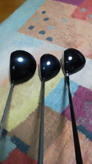 第二次マイ・ゴルフブームです。ミレニアム以前のクラブを使っていたので、おもいきって(というか、衝動買いで)ほぼ全て新しいものに買い替えました。といっても、3W以外は中古で、アイアンは2000年ものですけど。。。クラブの中でも、ウッドの性能は相当進化が早く、飛距離・打ちやすさ・方向性など、格段と進んでるようです。まあ、結局腕次第なんでしょうが。 ただ、形の変化だけは間違いなくすごいです。ゴルフ場で人のドライバーと比べてみると、まるで大人と子供。他の人の5Wと同じくらいの大きさでした。試しに今回買ったものと、実際に比べてみました。左が新しいドライバー。真ん中がいままでのドライバー。右が新しい3W。普通に大きさを比べれば、確かに5Wといっても遜色ない。。。ちなみに、ドライバーは中古でも人気の高いものなので、今回揃えたものの中では一番高価でした。人気と性能が高いほど、値段も高いということですね。