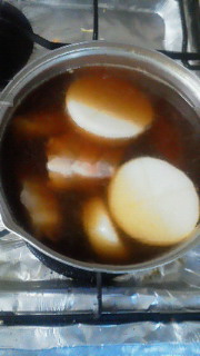 さすがに四月なので、もうじき、ストーブともおさらばでしょうが、またまたストーブ料理です。今回は、ぶり大根。ぶりは塩を振りかけて、しばらく置いた後、湯通しして水洗い。大根は米のとぎ汁で15分ほどゆでた後、水洗い。だし汁、お酒、みりん、砂糖、醤油と一緒に鍋に入れて、ストーブの上でことことと。。。ストーブだとほっといても吹きこぼれることはないし、じっくりと味がしみこみます。 しばらくすると画像のぶり大根の出来上がり。下ごしらえの手間はかかりますが、大根もぶりも柔らかくておいしいですよ。