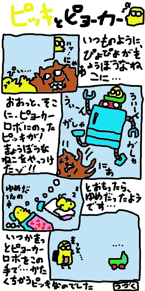 ひよこ兄弟は、一番上が女の子(ピッカ)なので、2番目のピッキは長男です。ピッキは、お勉強が大好きなガンバリ屋さんです。気が弱いのであまり前には出ませんが、実は、おおきな夢を持っています。。。