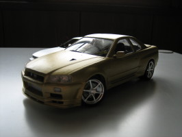 え~、ついにBNR34のプラモが完成しました~。ボディはゴールド、筆塗りで、しかも塗装下手でーす。