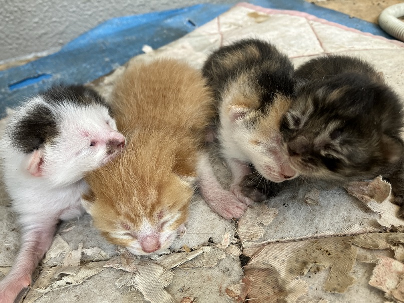 猫猫相談。庭で子猫が生まれていると。ベイベー達。まだまだチーチーですね^^こちらがお母さん猫。まだ若い感じがする。体格も顔つきもいいのでしっかりご飯食べている感じがします。5匹生まれていたようですが、1匹はカラスか何かにやられてしまって。。。現場には小さな小さな腕先だけが残っていましたケージを置いてみた。外からの目隠し的に。陽も照りつける場所なので寒冷紗も設置してみました。母猫ですが威嚇はそう強くないのですが、警戒心はあります。ケージの中に子猫を移動させて様子観察。なかなか母猫がケージに入ってくれない。フード置いてみてもなかなか入らない。とりあえず様子を見てみることにしました。このあたりでは地域猫をやっているみたいなので相談者に情報収集をお願いしてひとまず退散。外での生活はやはり危険と隣り合わせですね。亡くなったベイベーに祈りを捧げます。生き残った4匹と母猫には幸せになってもらいたいです。