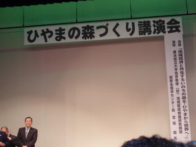 演題は 『地域経済と共生するいのちの森をーひやまから世界へー』でした。 自然保護や植物観察などに関心があるので会場へ入る前より心が高ぶっていた。 「木を植えよう」は「命を植えよう」なのだと勝手に合点しながらうるうるする。