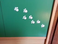 ちょこっと模様でこんなに可愛く 先日色塗りをした戸棚。 (気になる方は過去の記事からどうぞ) そのままでもキッチュな色合いで可愛いんだけど もう一捻りあってもいいね~と 模様を入れることにしました。 カントリー風のステンシルも素敵だし かすれ具合の風合いも面白い。 どんなのにしようか悩んで やっぱりにゃんこ好きな私が選んだのは足あと ネットで探したら 可愛いイラストや小物がいっぱい見つかりました その中で参考にしたのがこちら。 この足あとをもとに 肉球の大きさを微調整して 歩く歩幅と進路方向をちょいちょいとおさるがイメージ。 それを紙に印刷して、切り取ります。 こうするとあっという間に即席ステンシルプレートの出来上がり 強度的には使い捨てですが、この方法だと いろんなイラストで気軽にステンシルができます。 これをマスキングテープで扉に貼って エアブラシもしくはスプレーでシュッと色をつけるだけ。 乾いたらこんな素敵なの完成です 右下に重点を置いて足跡をつけてみました。 ぜんぶにつけると子供っぽくなっちゃうからね。 そのままの時よりも可愛くよりハンドメイドになるでしょ 第一弾のお試しは成功しました まだまだペンキもあるし、ステンシルの要領もわかったので 次はどんなものに手を出してみようかな~ 布小物はやったことがあるので ガーデニング用品とかの大作もいいですね~ 面白かったらぽちっと1票お願いします。人気blogランキングへ にほんブログ村