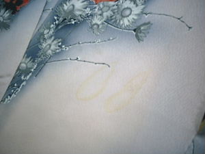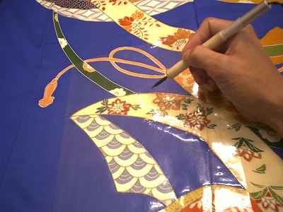 皆様いかがお過ごしでしょうか?京都は雪こそ降りませんが、やはりまだまだ寒いです。でも、日は、かなり長くなりましたね。5時頃でもまだ、明るいのは何だか嬉しいです。はやく、暖かな春がやってきてほしいものです。さて、今回ご紹介するお直しは地直しの作業です。お着物のケアは早目が大事ですが、デリケートな絹は気付くと染みが変色してしまっていた・・・なんてことになりかねません。そんな時も諦めないで下さい。当工房では、そんな黄色くきつく変色してしまった染み(黄変・・・染みが付いてから日数が経過し生地自体も変色してしまったもの)も『地直し』という作業で見事にお直しいたします。作業工程といたしまして簡単にご説明差し上げると、1、薬品で黄ばみとお着物の地色を抜きます2、その後数種類もの色の染料を混ぜ合わせ、お着物の地色と全く同じ色の染料をお皿に作り出します3、筆を使いその部分をその染料で塗っていき仕上げますという工程になります染み抜きといいますより地直しと呼ぶ、高度な技術と大変な手間のかかる作業です。早速、その地直しをし、蘇ったお着物をご紹介いたしますまず始めの写真はお直しする前の着物です。↑次の写真は、染み箇所に薬品を塗り、蒸気コテにて熱を加えてきつい黄ばみ(黄変)を抜いているところです。↑そして次の写真は、黄ばみと一緒に抜けてしまった地色を、色合わせをし作り出した染料で筆を使い、色を掛けているところです。↑そして最後の写真は、色を掛けて出来上がった状態です。↑最初の染みの箇所がどこか見分けも付かないくらいに仕上がりました。このように薬品にて黄ばみを抜き、色を掛けて染みをお直しする方法を地直しといいます。地直しには色合わせの技術が必要となります。完璧な色合わせを習得するには、色の勉強を含め、かなりの修行を積むことが必要です。当工房では、丸洗いや洗張り、お仕立ての他に技術が必要となる難しい染みのお直しなどにも力をいれております。つい先日も、『他店のどこに出しても直らず、無理だと断られ諦めていた・・・』とおっしゃる大切な代々のお着物も上記のような方法で、お直しし綺麗に蘇り、再度袖を通していただける状態にさせていただきました。大変感激していただき、私もお力になれたことが嬉しく、そのようなことが毎日の加工の励みになっております。丸洗いのオークションのほうも、お蔭様で多くの方にご利用いただいております。そして、一度ご利用いただいた方の75%以上の方にリピーターとして引き続き、ご利用いただいております下記の当工房のホームページよりご覧いただけますので、よろしければ是非一度ご利用くださいませ。お直し工房ホームページはこちら丸洗い特別企画ヤフーオークション会場はこちら