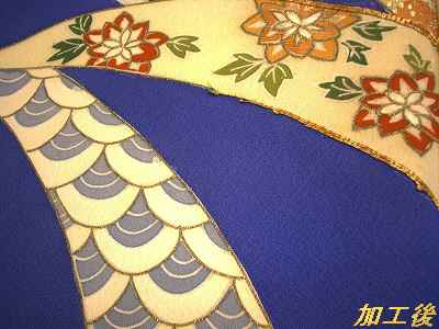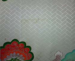 今回は金加工でしみを隠したり、派手になってしまった柄を渋くした加工を紹介します。まず下の画像は黄変している状態で加工前になります。そして次に下の画像は金加工でしみを隠した、加工後の画像です。そして次に、梅柄のピンクが派手になりましたので、金加工で渋くしました。下の画像が、加工前になります。次に下の画像が金加工後になります。このように金加工などの加工によりまして、いろいろと諦めていたお着物が、よみがえります。詳しくは下記の当工房のホームページをご覧ください。まだまだ、金加工の紹介もしていきたいと思って降りますのでお見逃しなく。 お直し工房ホームページはこちらです。