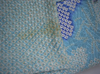 今日は絞りの着物のお直しをしました。下の画像の通り黄変してしまっています。まず、絞りの場合普通にしみぬきをしてしまいますと絞りが伸びてしまいますので下の画像のような胡粉というもので白場を筆で一箇所ずつ塗っていきます。すると下のように大分わからなくなります。このお直しも一枚の着物にたくさん黄変がありますとかなりの時間がかかりますが、これで絞りであってもまたきれいに着てもらえることができますよね。